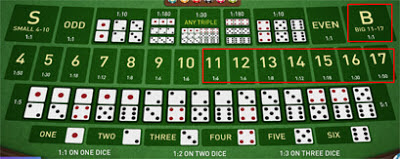 K Big (besar) Jumlah dari ketiga buah dadu adalah 11 sampai 17. pembayaran 1 x Pasangan. Triple dadu tidak termasuk besar
